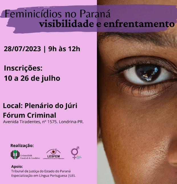 Promovido em parceria com o Laboratório de Estudos de Feminicídios (LESFEM) da Universidade Estadual de Londrina e por Néias – Observatório de Feminicídios Londrina, com o respaldo do Tribunal de Justiça do Estado do Paraná e o apoio da Especialização em Língua Portuguesa – UEL, o evento abordou a temática "Feminicídios no Paraná: visibilidade e enfrentamento", concentrando-se na análise das medidas protetivas contra os casos de feminicídio ocorridos no estado.