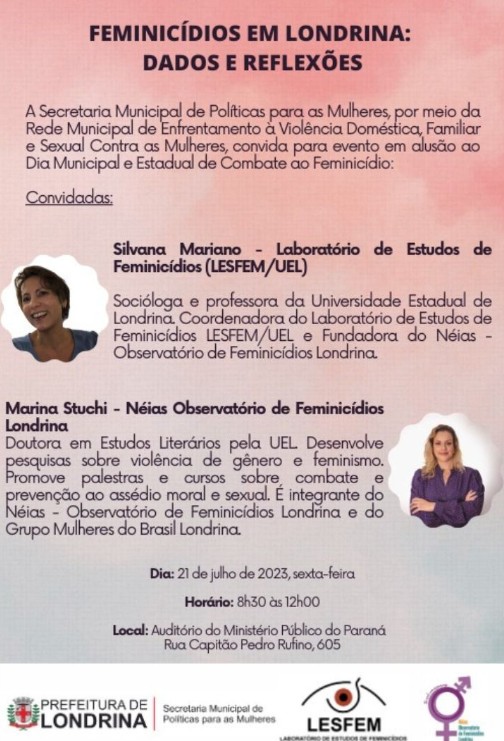 Contamos com a valiosa participação de Marina Stuchi e Amanda Marcondes, ativistas de Néias - Observatório de Feminicídios Londrina, cujo trabalho vem se destacando na luta contra a violência de gênero. Além disso, a ilustre participação de Silvana Mariano, fundadora do LESFEM (Laboratório de Estudos de Feminicídios), enriquecendo ainda mais as discussões e a busca por soluções efetivas.